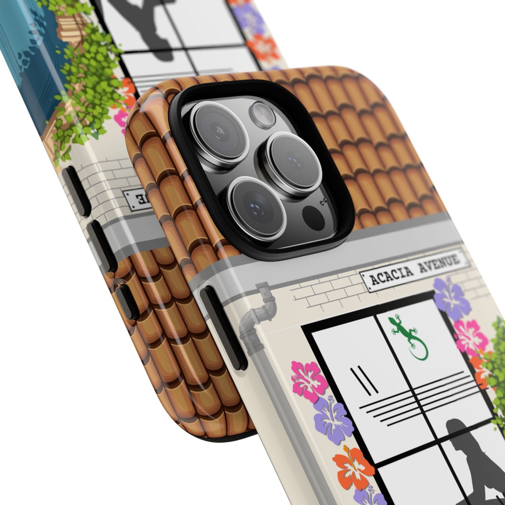 Bring a bit of tongue-in-cheek British suburbia to your phone. This design features a cosy window-silhouette scene, colourful blooms, sunflowers, a curious cat and that "nice street but something feels a bit off" charm. A playful, warm snapshot of Acacia Avenue wrapped around a tough, protective case.