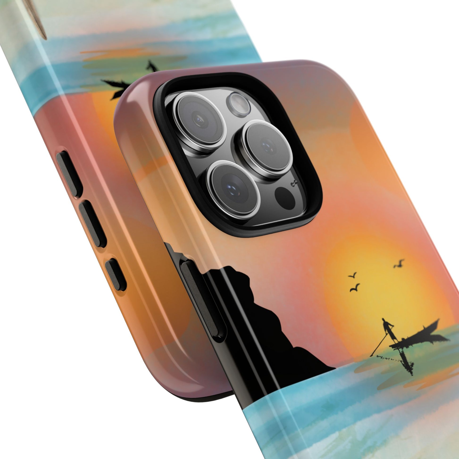 Transform your phone into a window to peaceful coastal beauty! This stunning tough case captures the essence of a serene Asian sunrise - featuring a lone fisherman on the horizon, glowing golden skies, gentle waves, and a peaceful seagull resting by a weathered boat. It's a scene that whispers calm yet speaks of quiet adventure.