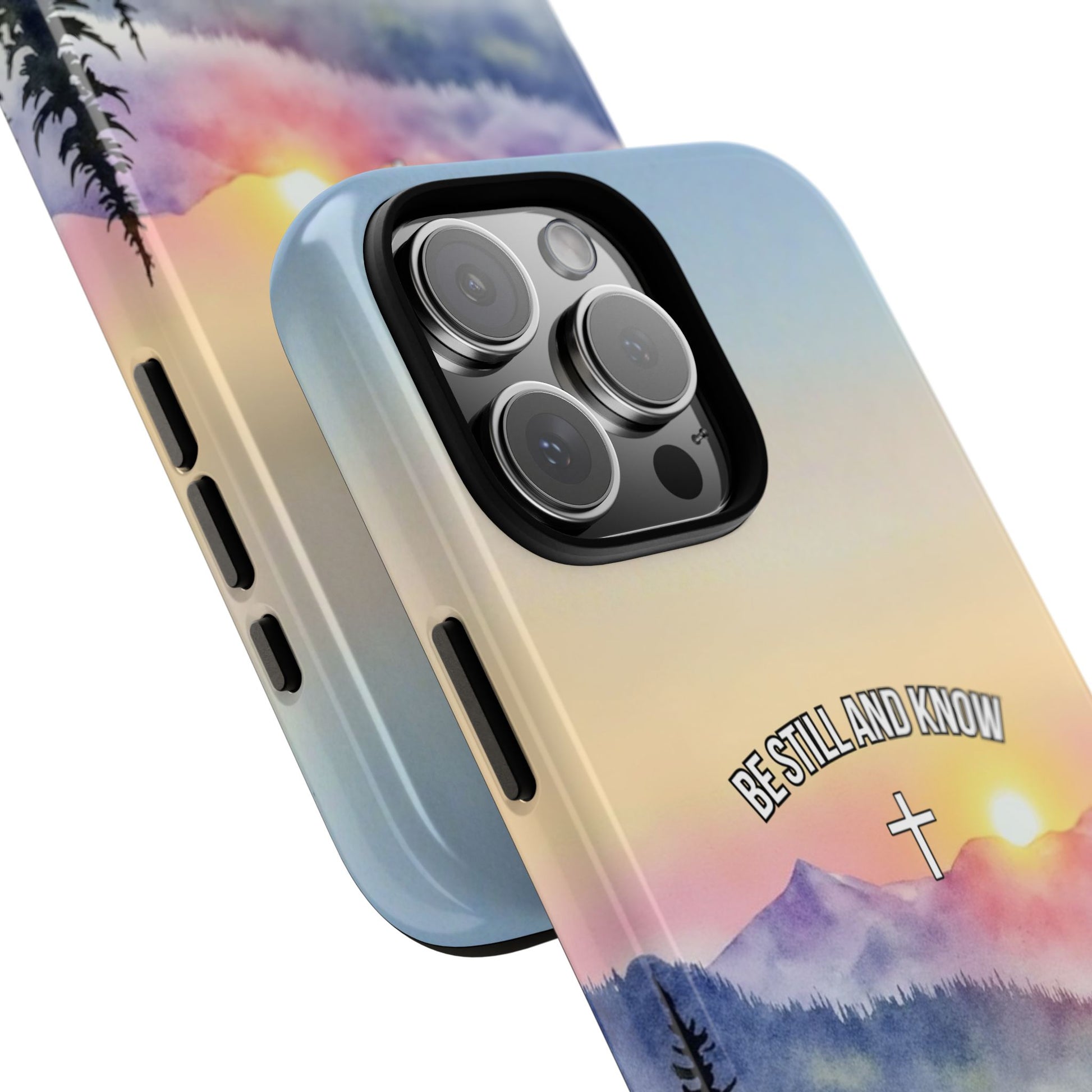 Be Still and Know - Mountain Sunrise Phone Case - Faith Quote with Cross - Christian Gift - Spiritual Art Tough Case