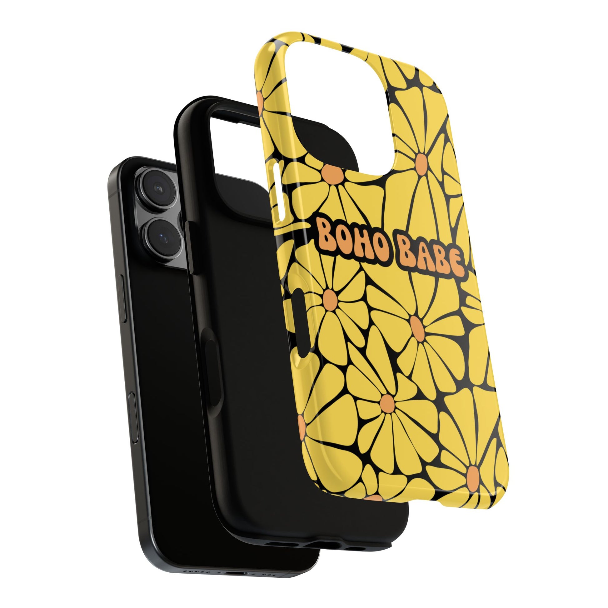 Boho Babe Yellow Flower Phone Case - Retro Boho Floral on Black Background, Bold Aesthetic Tough Case for Popular Smartphones