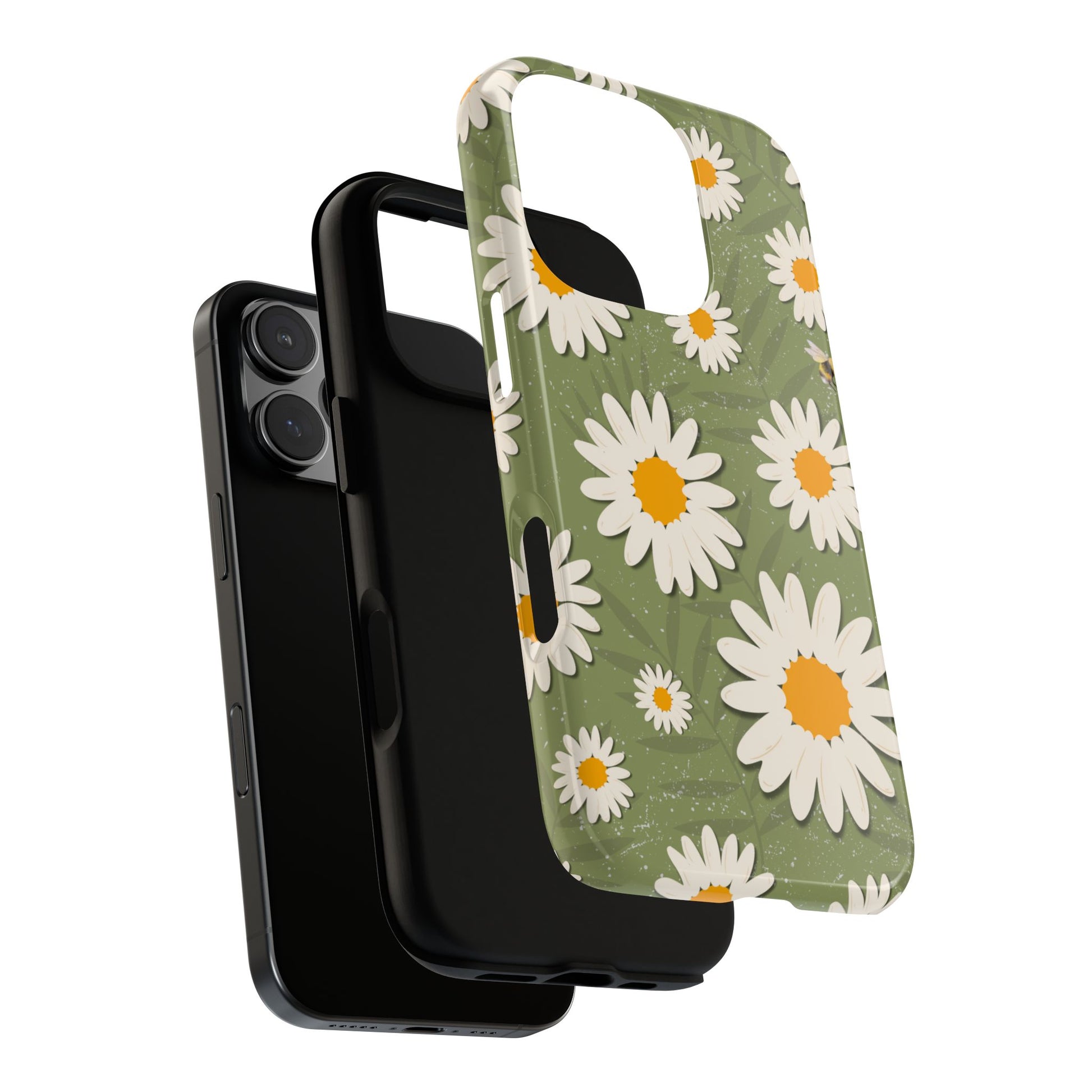 Step into a field of sunshine with our Daisy Days Phone Case. Featuring charming vintage-style daisies scattered across a rich olive green background, this case brings the carefree spirit of flower power to your everyday tech while providing superior protection.