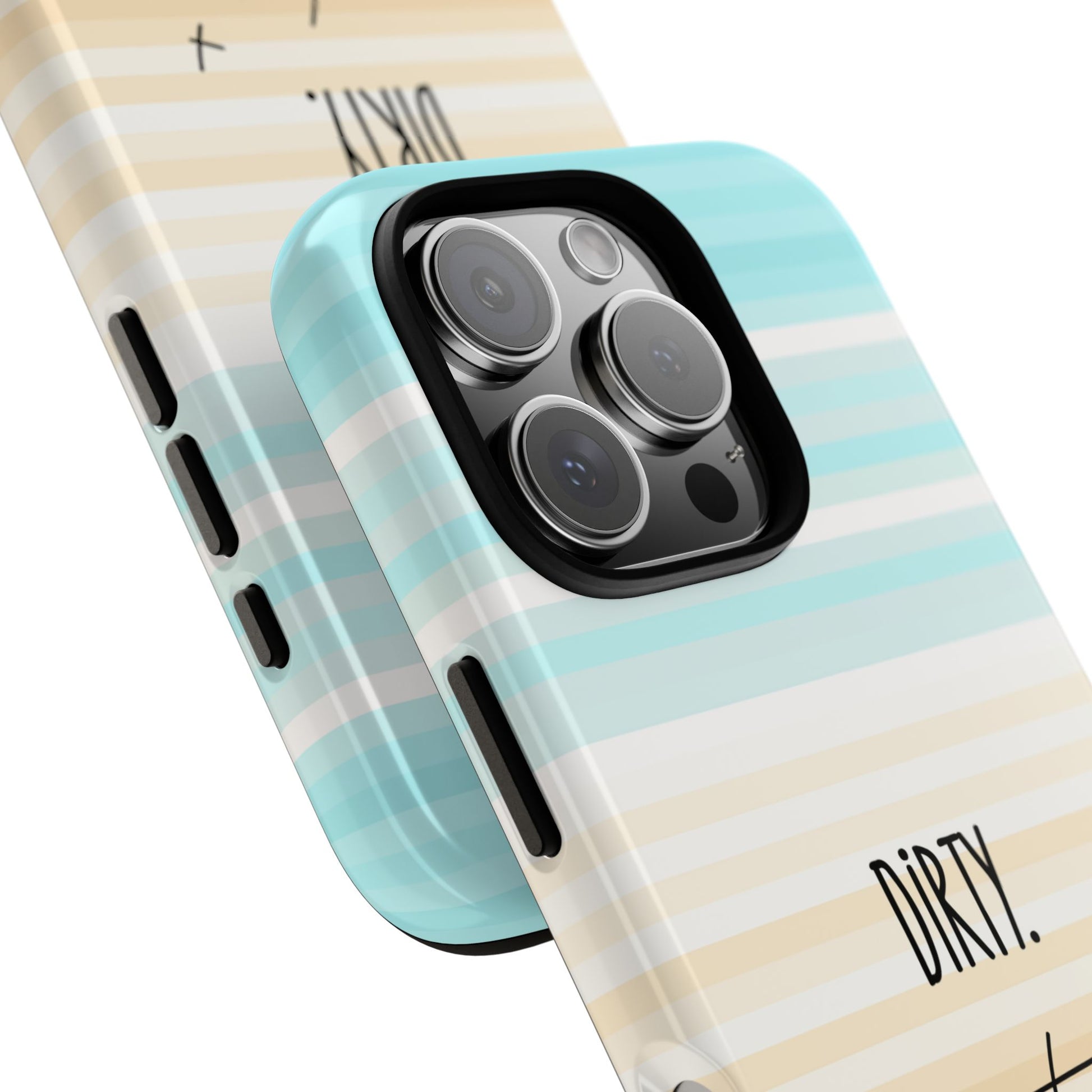 Add a splash of cheeky charm to your summer with our DIRTY Summer Cocktail Phone Case. Featuring a minimalist martini sketch against playful beach stripes, this case brings cocktail hour vibes and flirty humor to your everyday tech while providing superior protection.