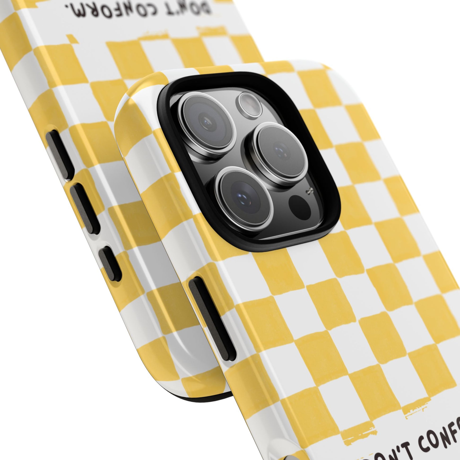 Refuse to blend in with the crowd with this bold Don't Conform phone case featuring striking yellow checkerboard design - the perfect statement piece for those who dare to be different and aren't afraid to stand out from the masses.