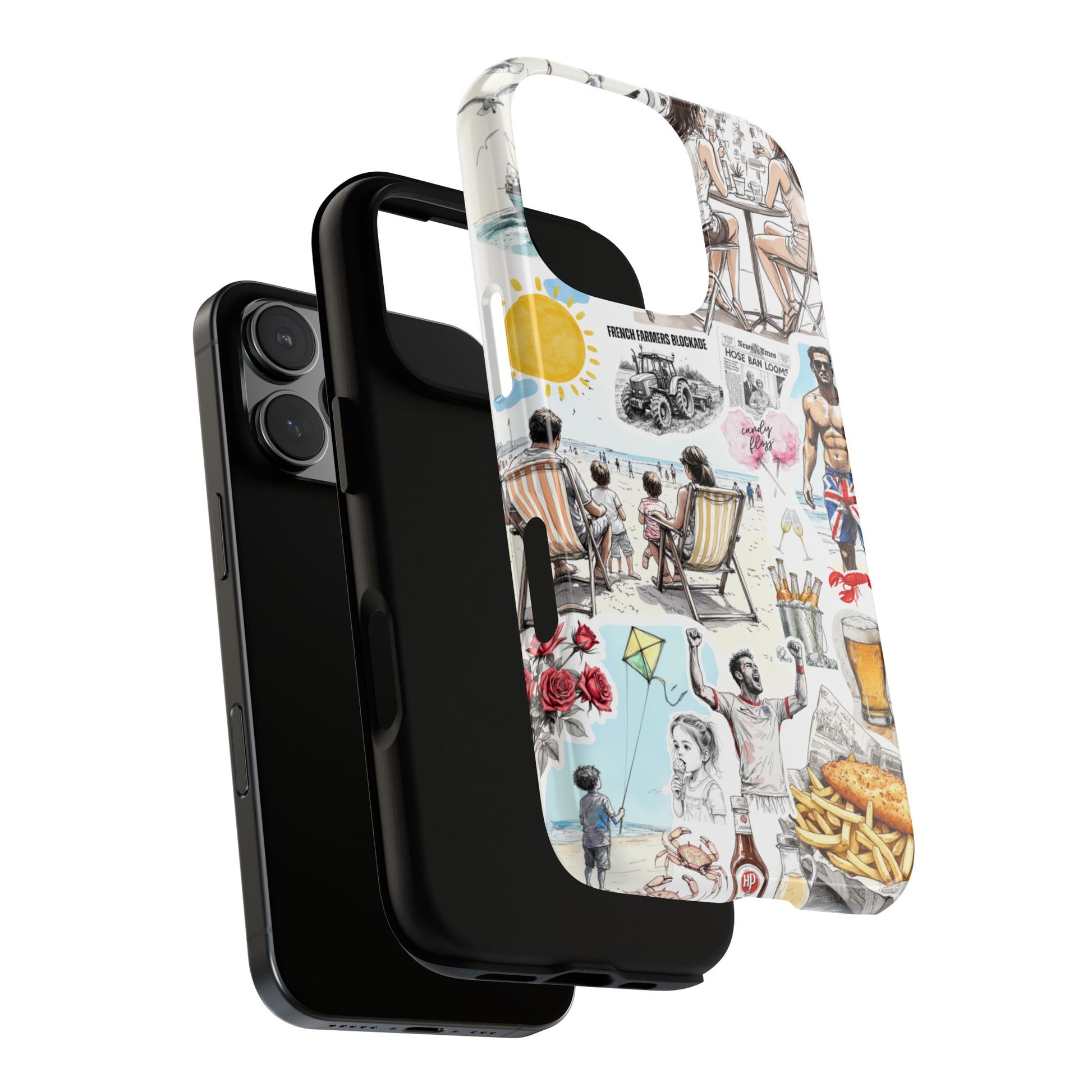 Celebrate the quirks, chaos, and charm of a classic English summer with this nostalgic collage-style tough phone case. From candy floss and crabs to football highs and hosepipe bans, this design captures the full British seaside experienceโdeck chairs, Union Jack swim shorts, and, of course, fish & chips wrapped in paper.