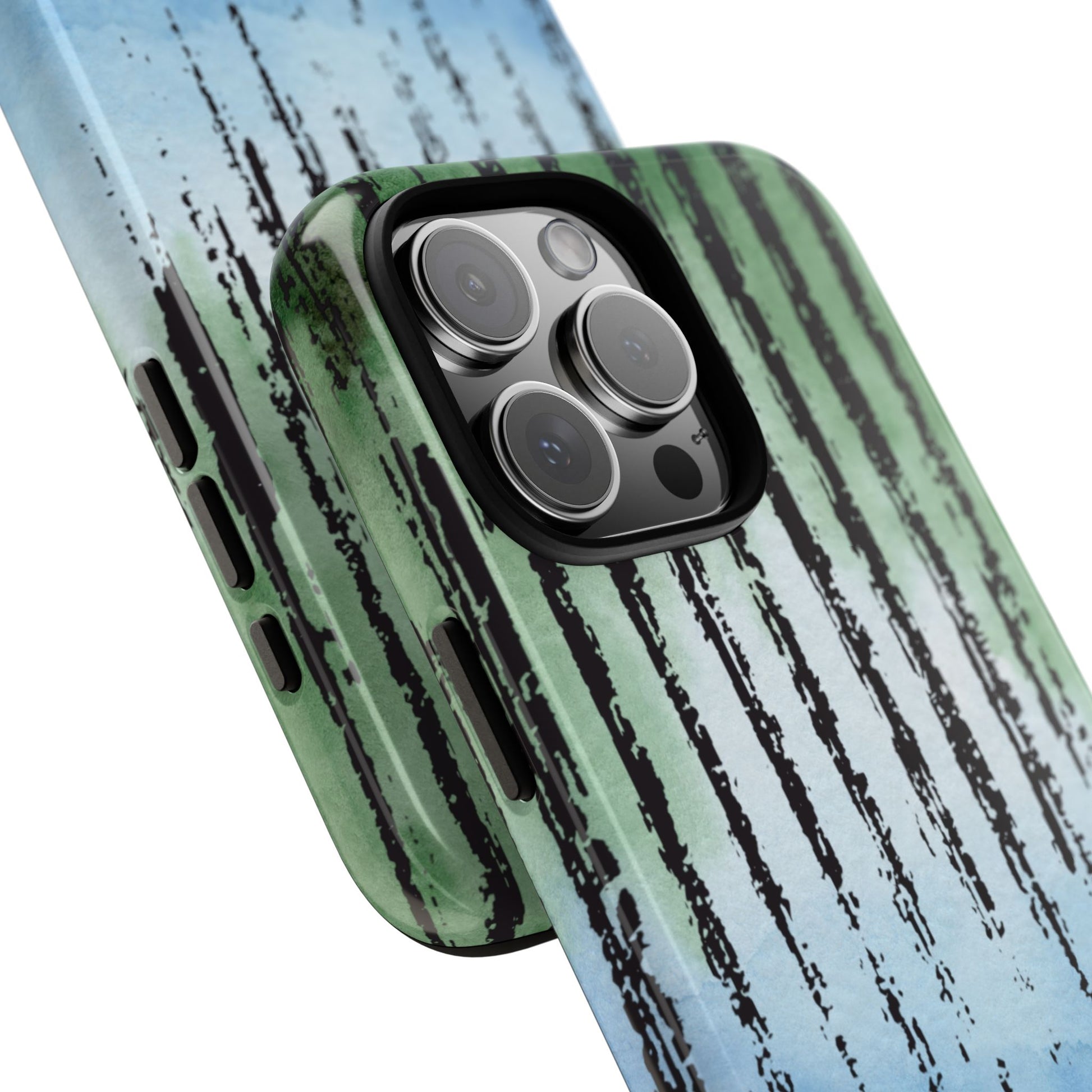 Immerse yourself in the tranquil beauty of this serene green-to-blue gradient design. Featuring vertical black paint drips that evoke misty forests and tranquil skies, this case brings the calming essence of nature to your everyday carry — with an edgy artistic twist.