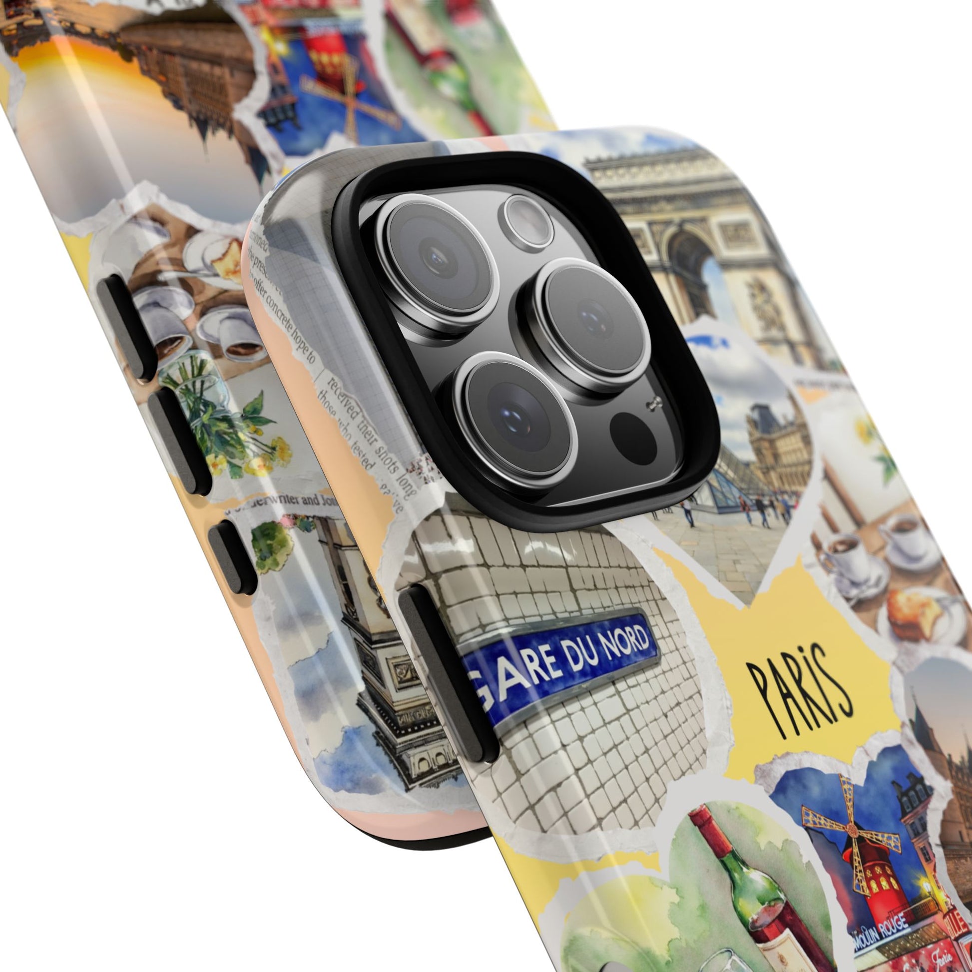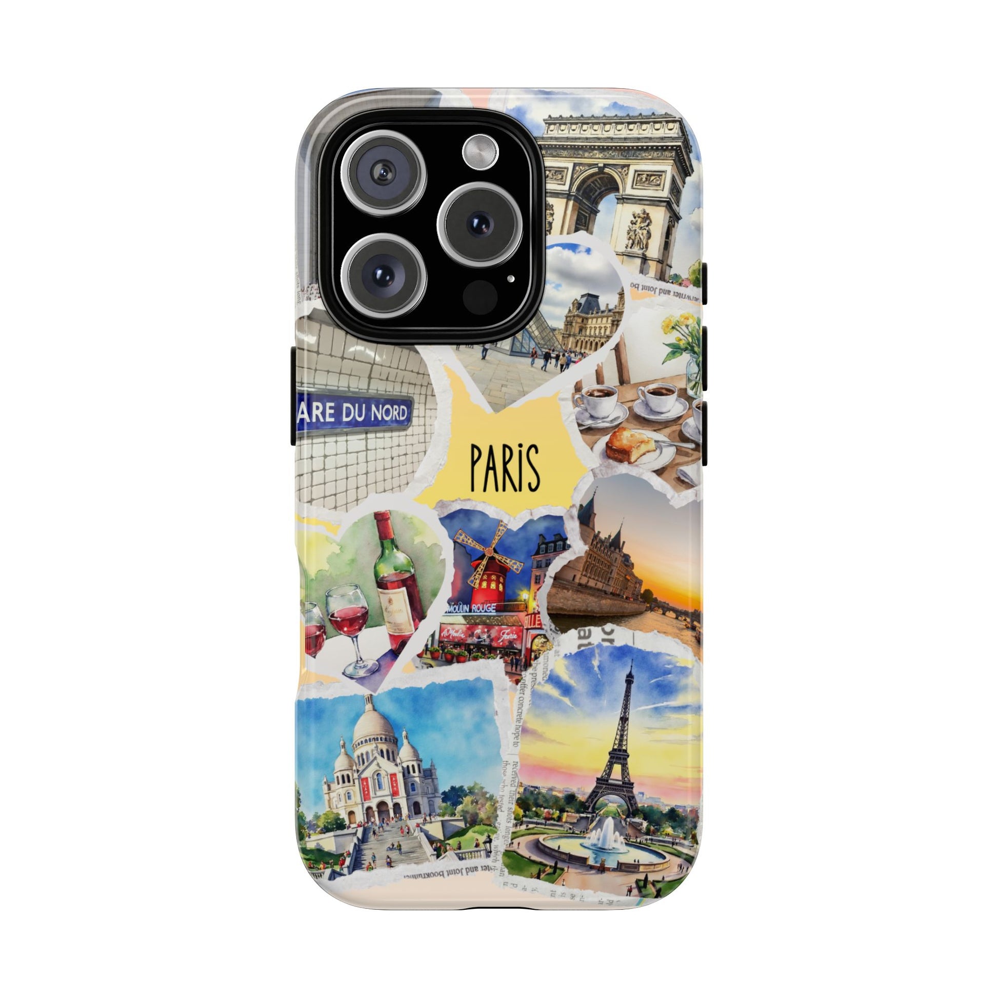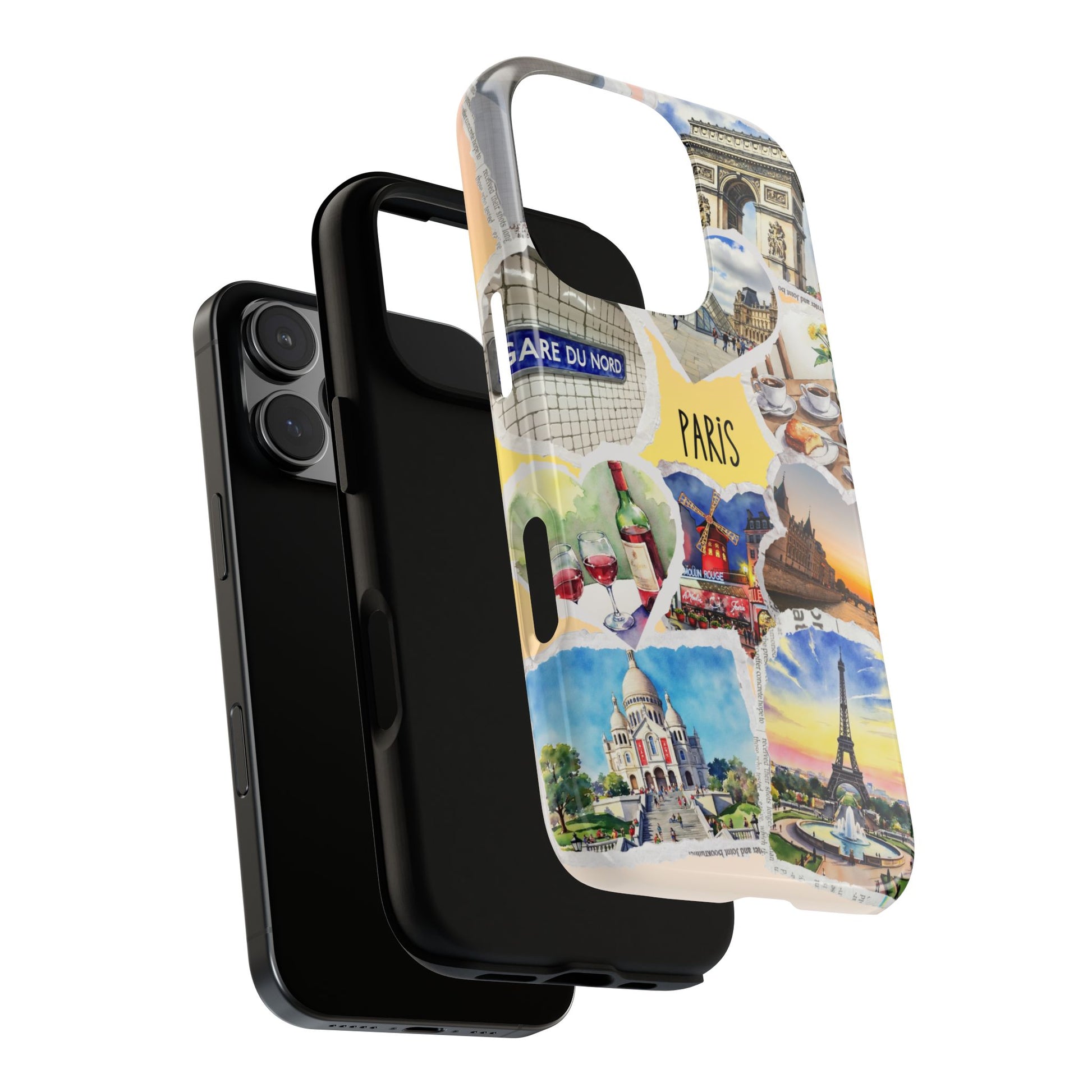 Paris France Tough Phone Case - Watercolor Collage of Eiffel Tower, Louvre, Wine & Coffee - Romantic Travel Gift for Her or Him