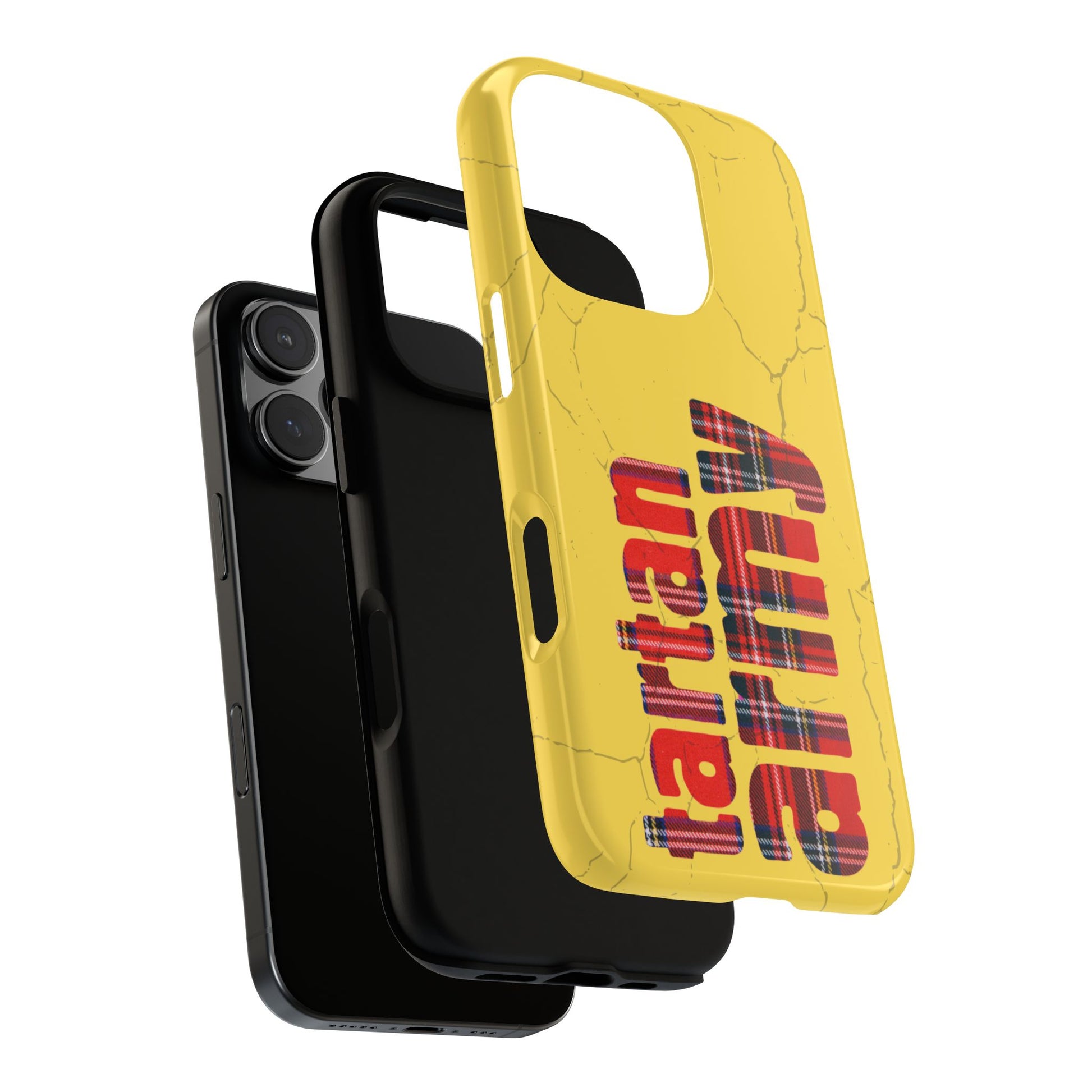 Tartan Army Phone Case - Bold Yellow Cracked Design with Scottish Plaid Text